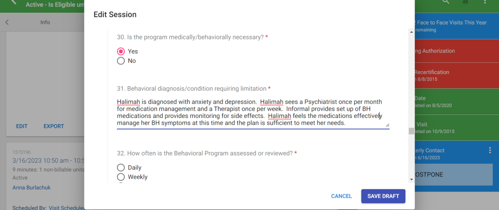Writing that the Participant has Mental health Diagnosis and writing that there is no plan or indicating that the plan is not fully effective to meet the participants needs would not be considered sufficient.