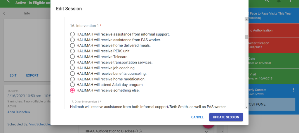 The PCSP is the document where all of the participants current and requested services are listed, along with goals that the participant has chosen to work towards. A PCSP needs to be done, with several other documents, at every New Participant Orientation (NPO), Annual, or Change/Trigger Event. Once a visit is scheduled in Function Portal, the SC clicks the “Document” button to begin working in the assessments that are listed in the Alerts on the right hand side of the screen.
